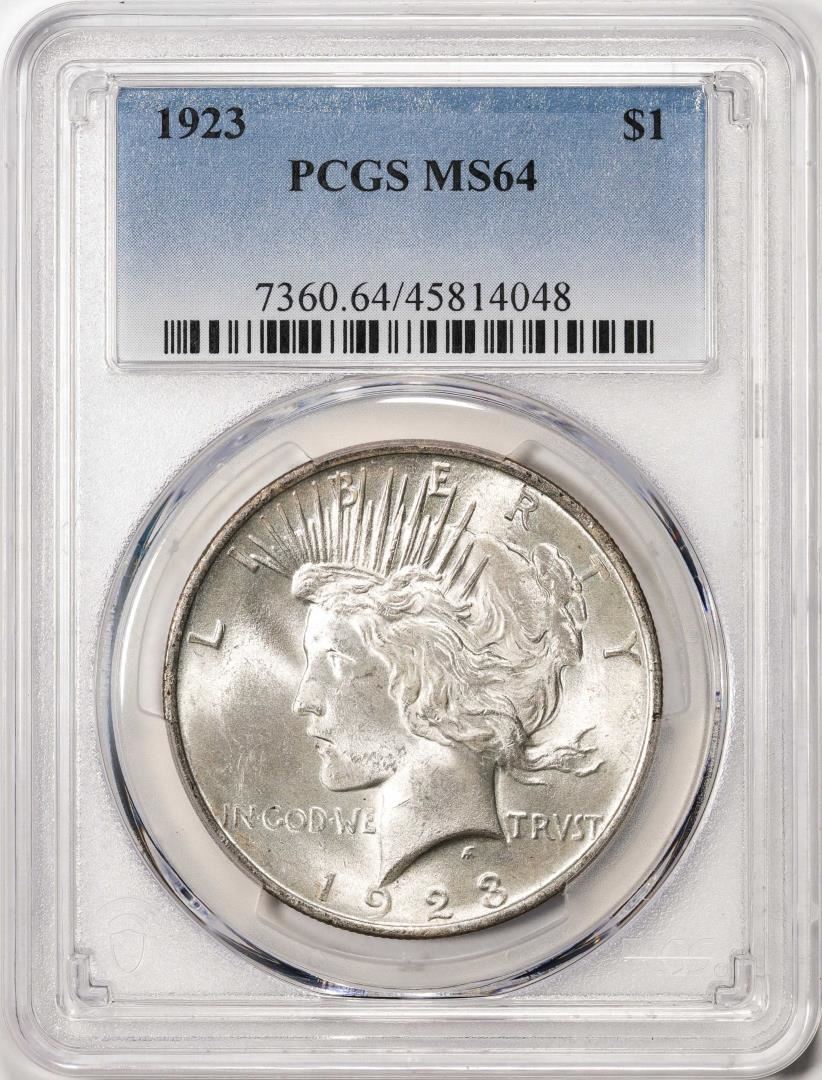 One 1923 $1 Peace Silver Dollar Coin PCGS MS64. PCGS Graded.