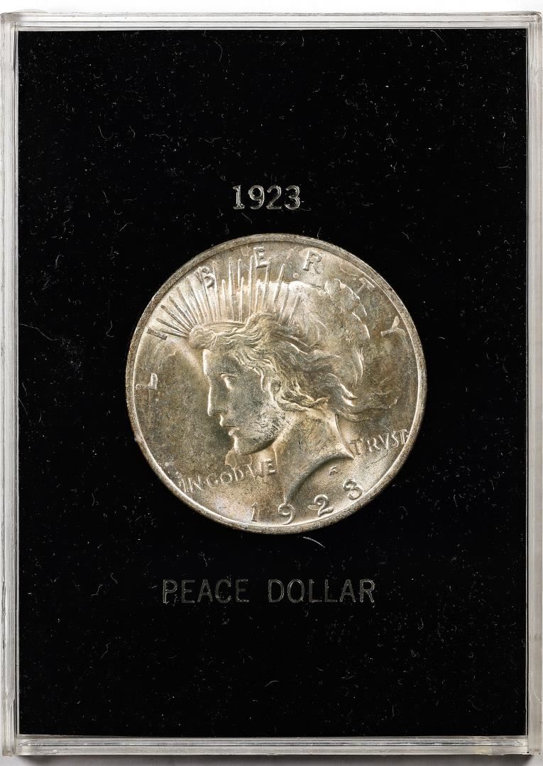 One 1923 $1 Peace Silver Dollar Coin in Holder.