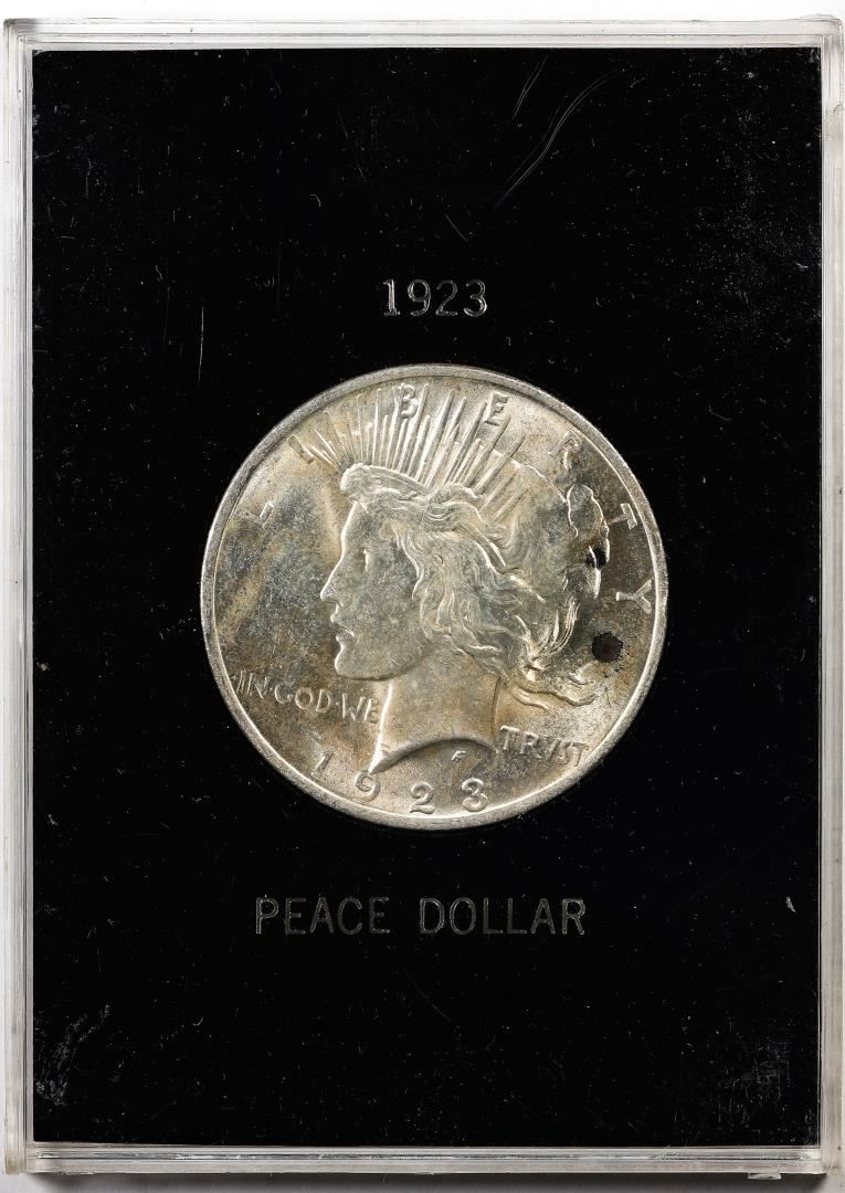 One 1923 $1 Peace Silver Dollar Coin in Holder.