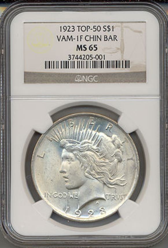 One 1923 $1 Peace Silver Dollar VAM 1F Chin Bar NGC MS65.
