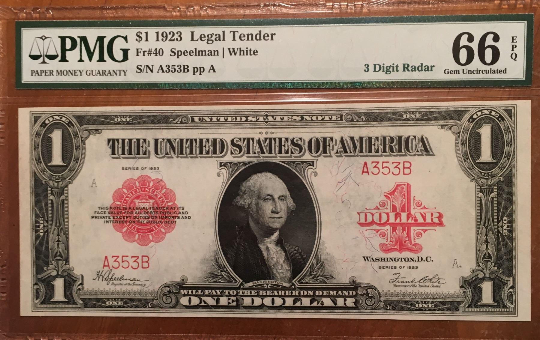 One 1923 $1 Radar Legal Tender Note PMG 66EPQ.