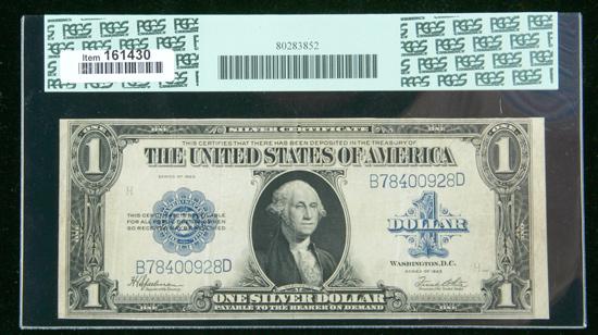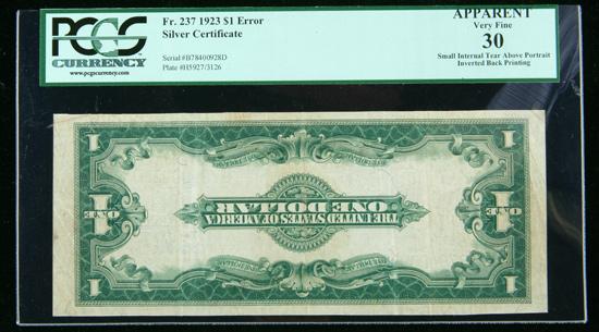 1923, $1 Silver Certificate. Inverted Back. PCGS Apparent Very Fine 30. . Fr-237. Although there is a small internal tear above the portrait as notated by PCGS Currency, this is an attractive VF-XF example of a popular and dramatic error with the back design printed upside down.