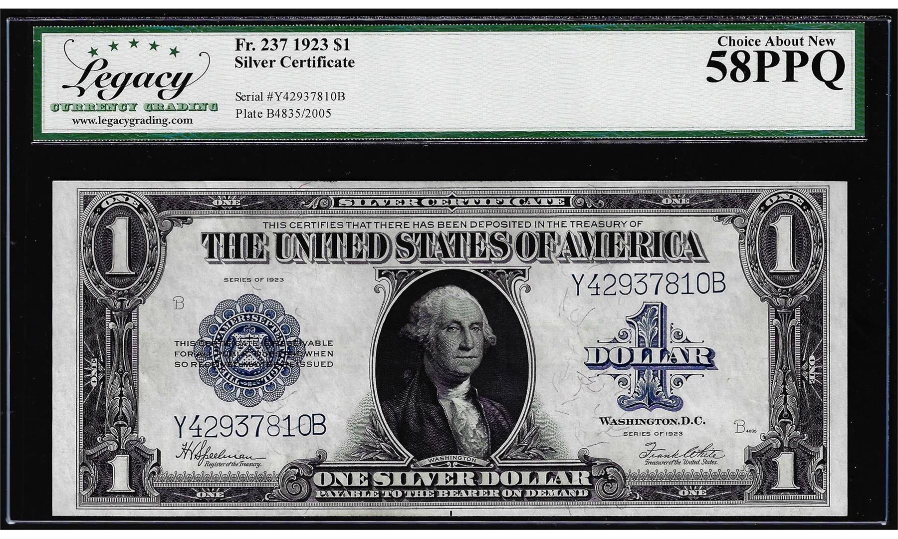 One 1923 $1 Silver Certificate Note Fr.237 Legacy Choice About New 58PPQ. Legacy Graded.