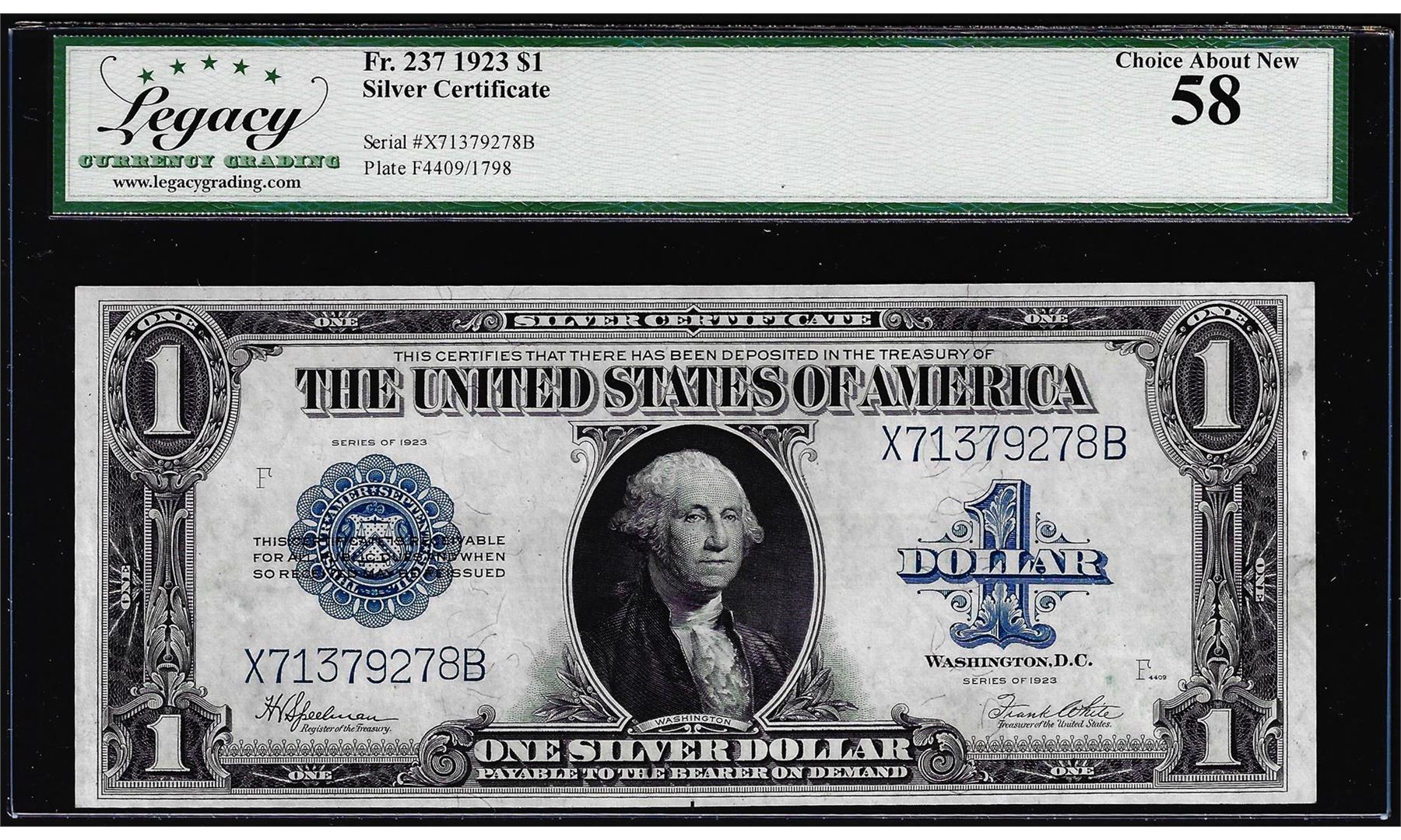 One 1923 $1 Silver Certificate Note Fr.237 Legacy Choice About New 58. Legacy Graded.