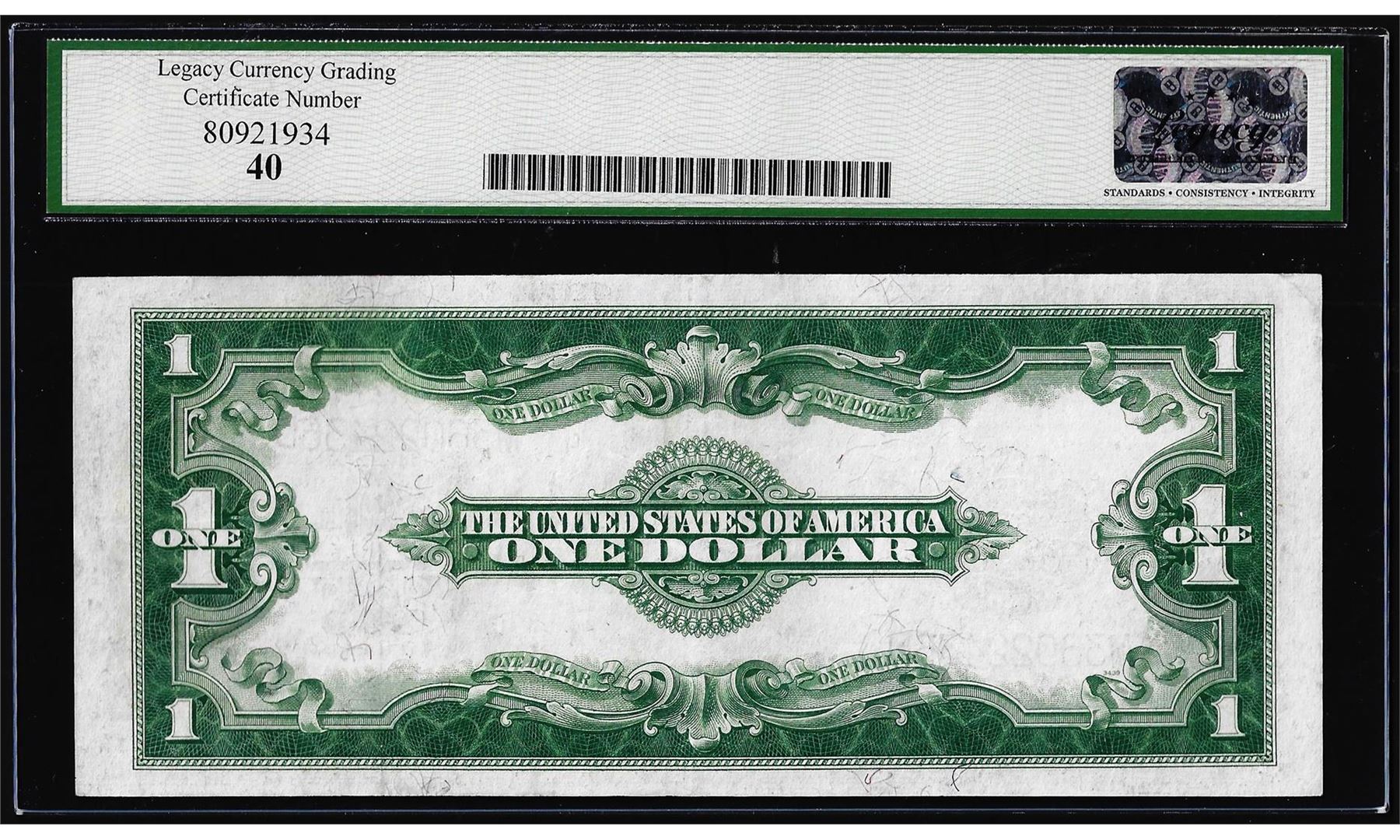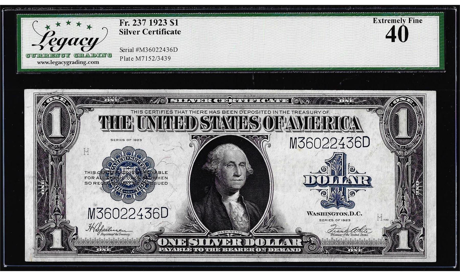One 1923 $1 Silver Certificate Note Fr.237 Legacy Extremely Fine 40. Legacy Graded.