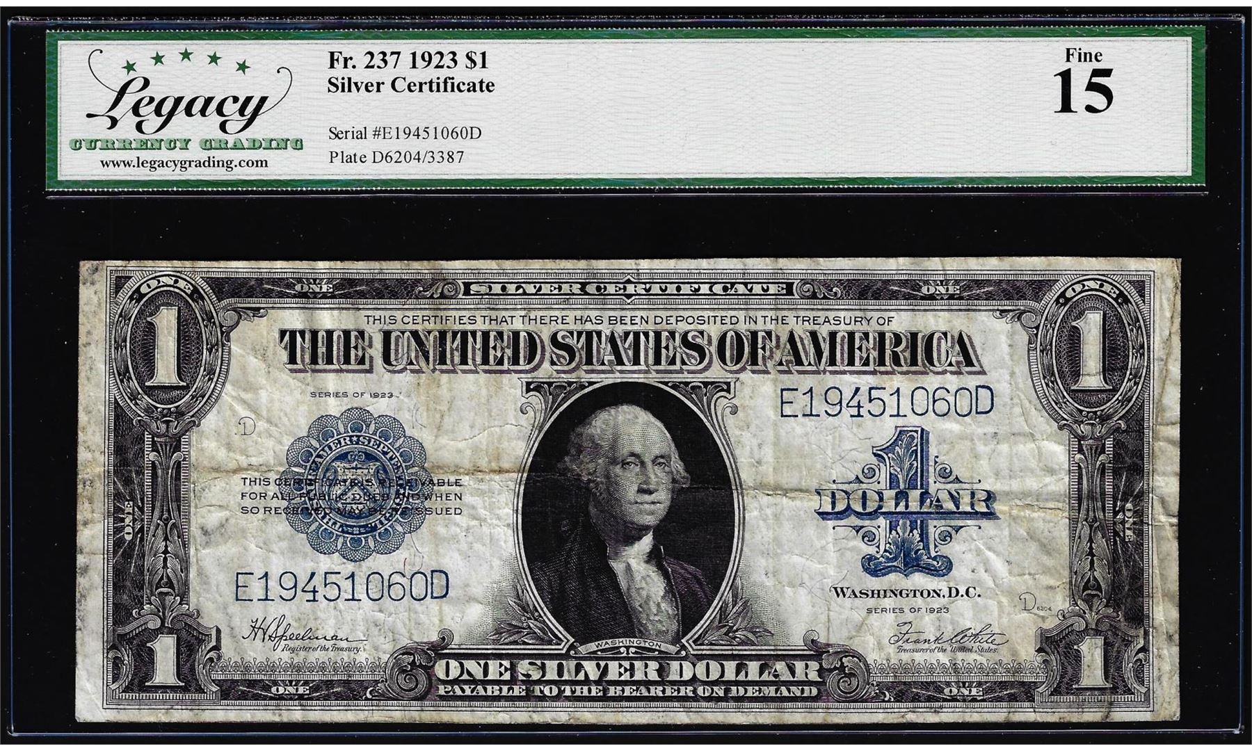 One 1923 $1 Silver Certificate Note Fr.237 Legacy Fine 15. Legacy Graded.