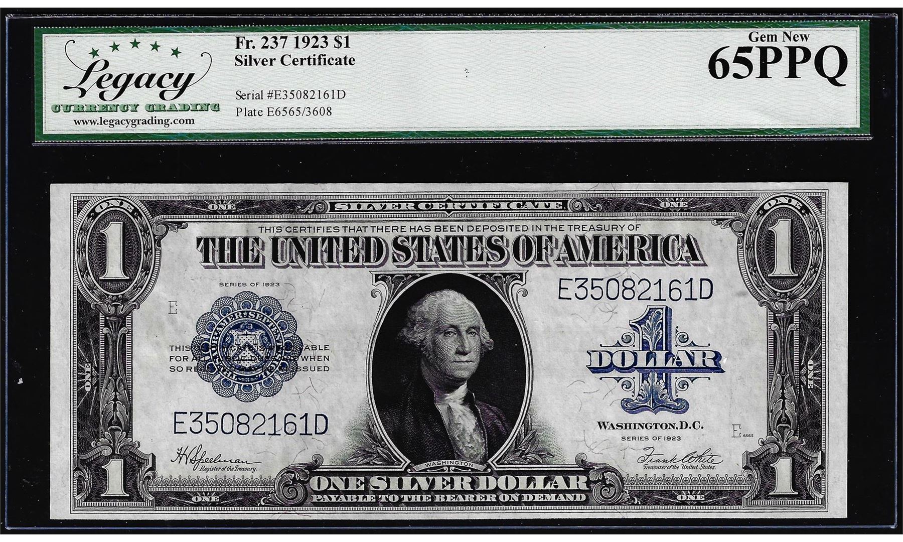 One 1923 $1 Silver Certificate Note Fr.237 Legacy Gem New 65PPQ. Legacy Graded.