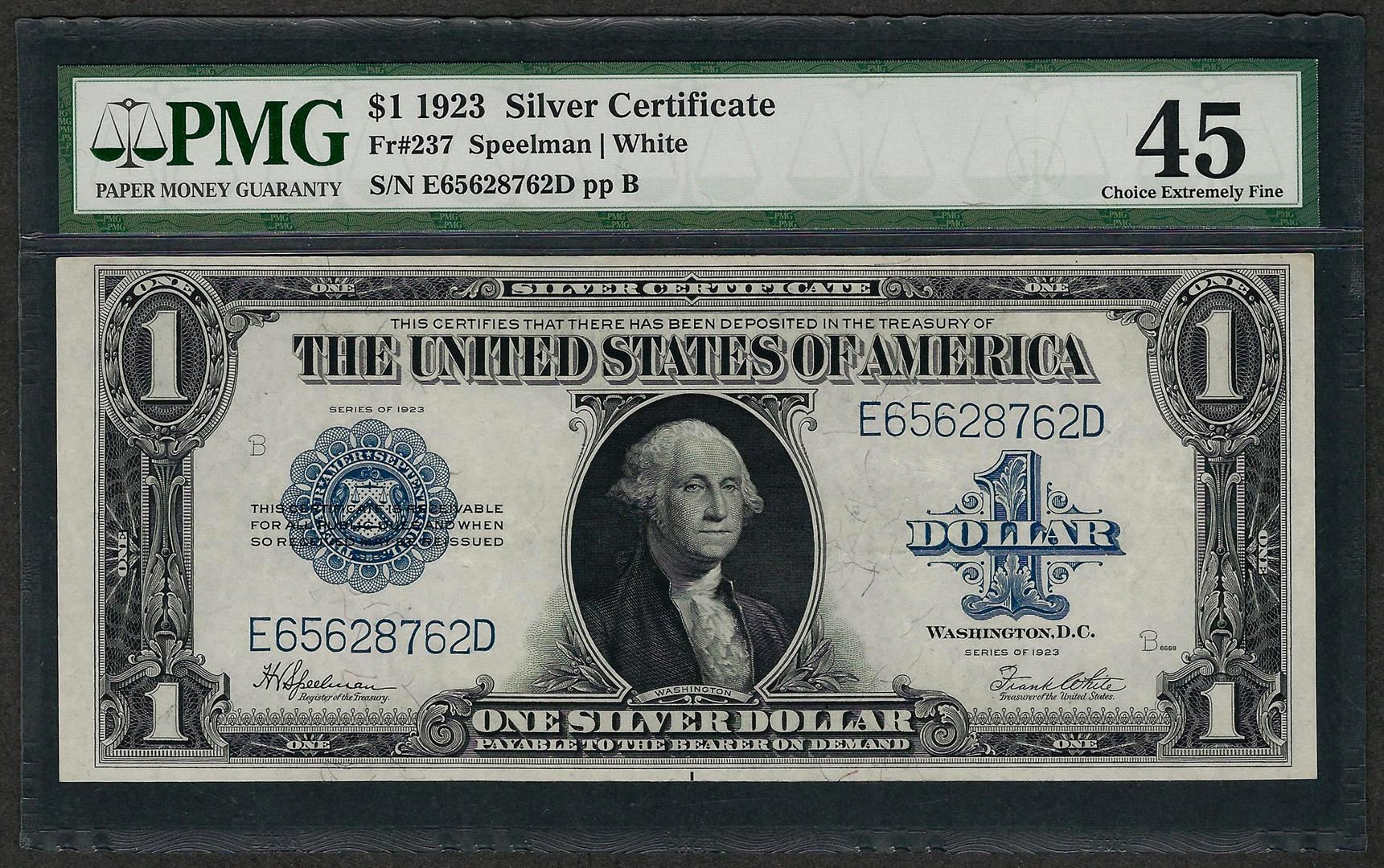 One 1923 $1 Silver Certificate Note Fr.237 PMG Choice Extremely Fine 45. PMG Certified.