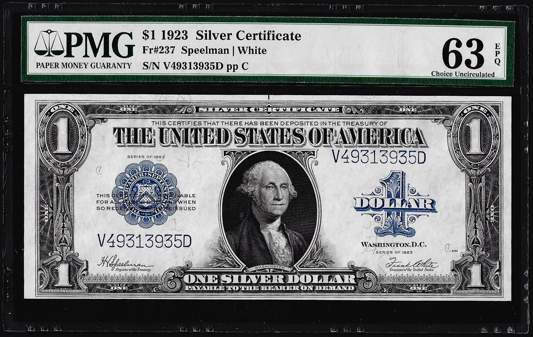 One 1923 $1 Silver Certificate Note Fr.237 PMG Choice Uncirculated 63EPQ. PMG Certified.