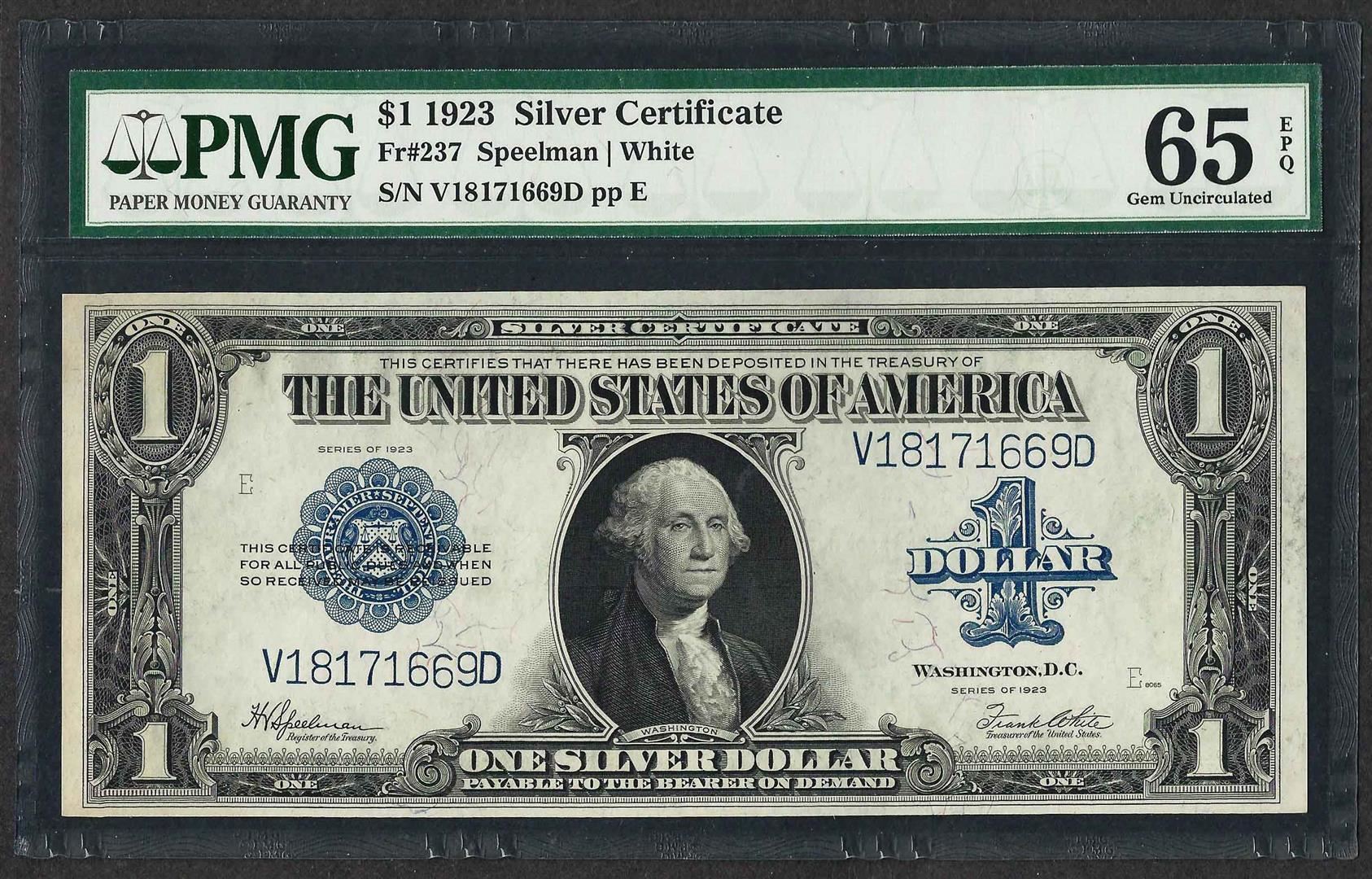 One 1923 $1 Silver Certificate Note Fr.237 PMG Gem Uncirculated 65EPQ. PMG Certified.