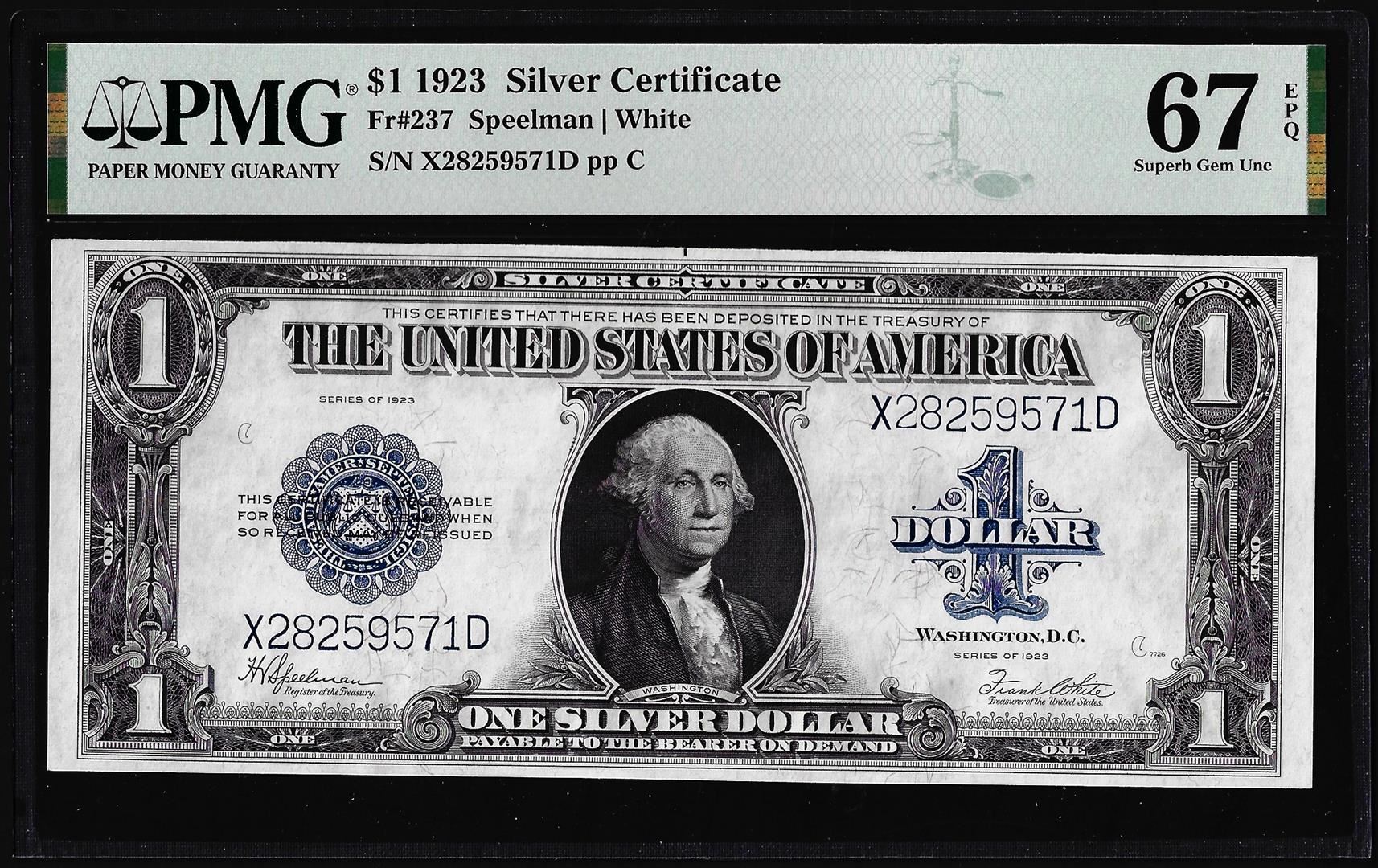 One 1923 $1 Silver Certificate Note Fr.237 PMG Superb Gem Uncirculated 67EPQ. PMG Certified.