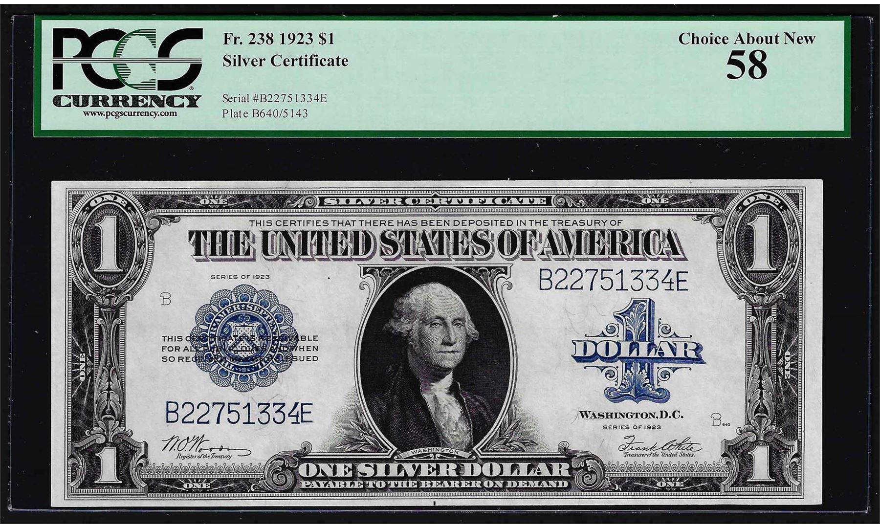 One 1923 $1 Silver Certificate Note Fr.238 PCGS Choice About New 58. PCGS Graded.