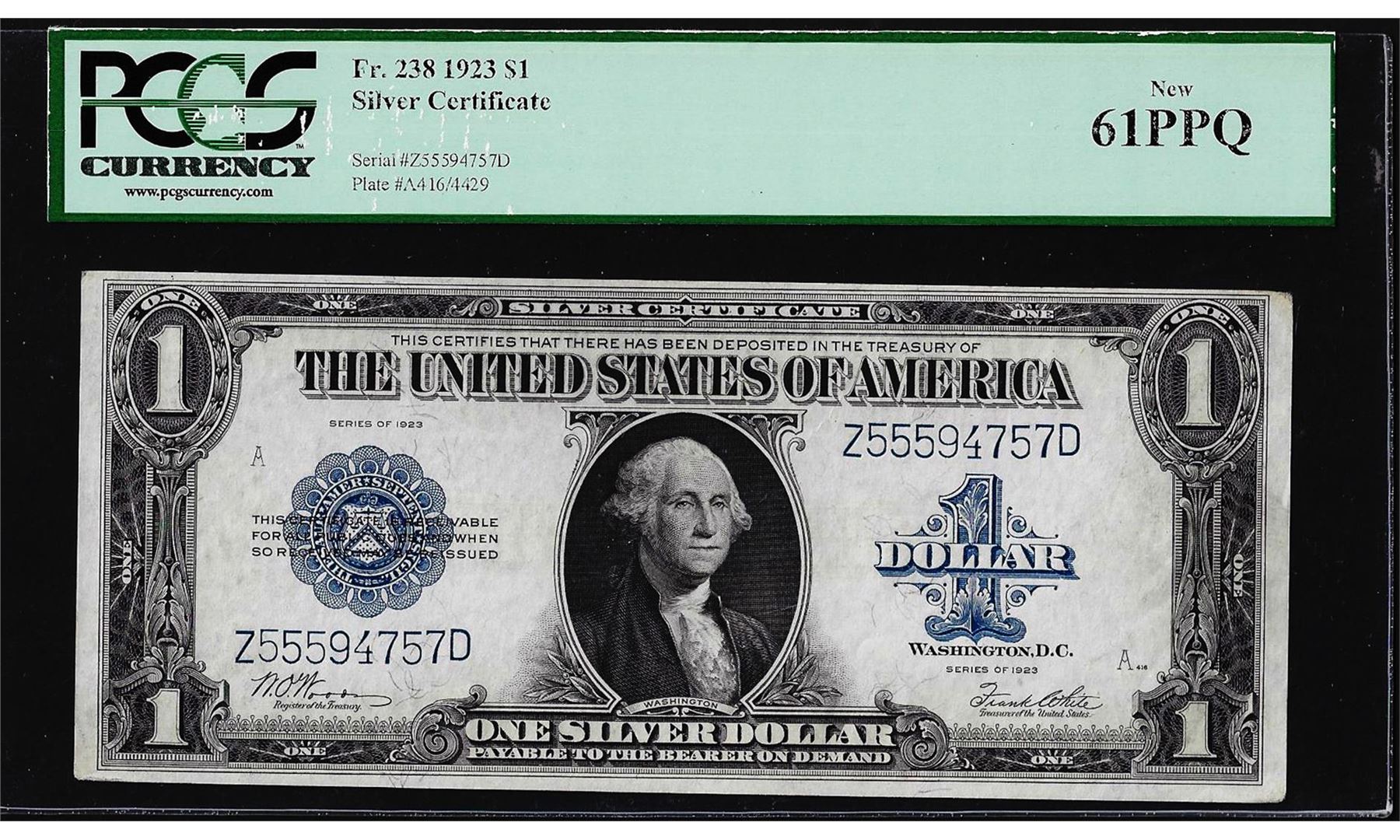 One 1923 $1 Silver Certificate Note Fr.238 PCGS New 61PPQ. PCGS Graded.