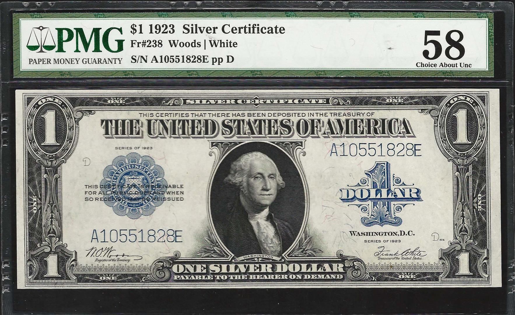 One 1923 $1 Silver Certificate Note Fr.238 PMG Choice About Uncirculated 58. PMG Appraised.