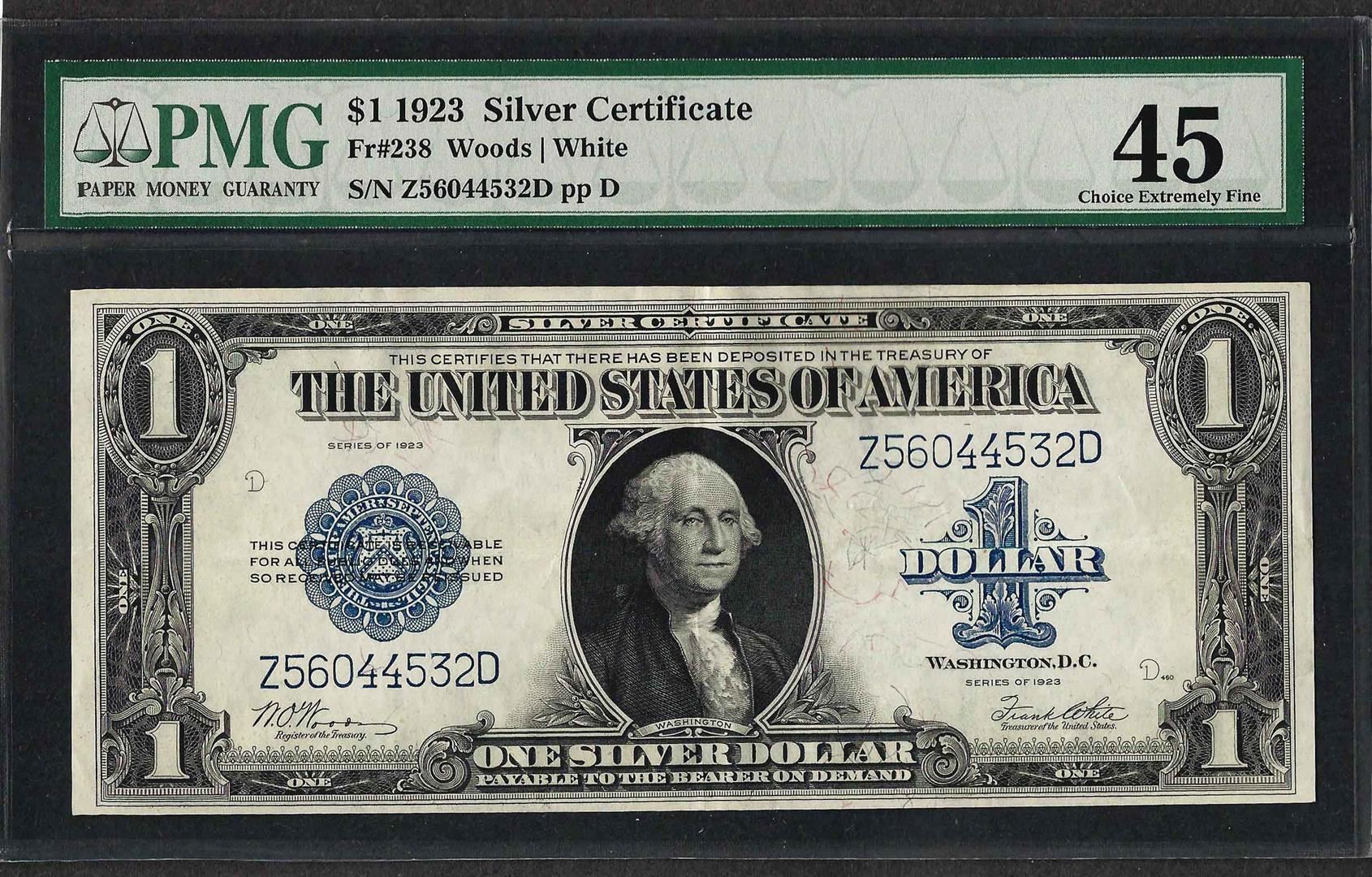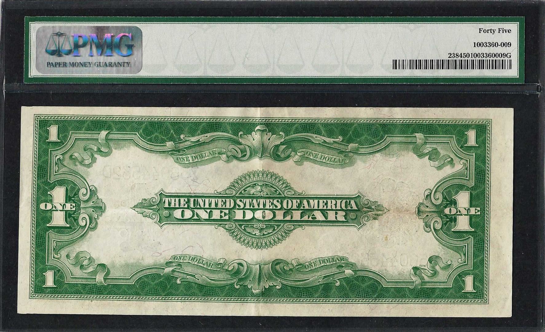 One 1923 $1 Silver Certificate Note Fr.238 PMG Choice Extremely Fine 45. PMG Certified.