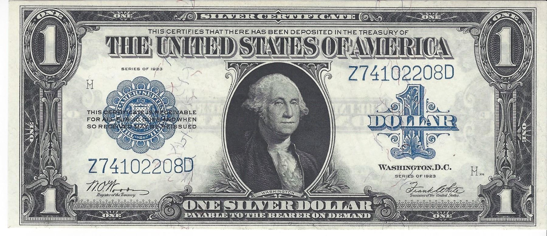 An excellent example of a $1 Silver Certificate note. The note is centered perfectly. No folds, rips, or tears or pin holes The ink pops off the note. It has excellent red and blue fibers throughout the note.