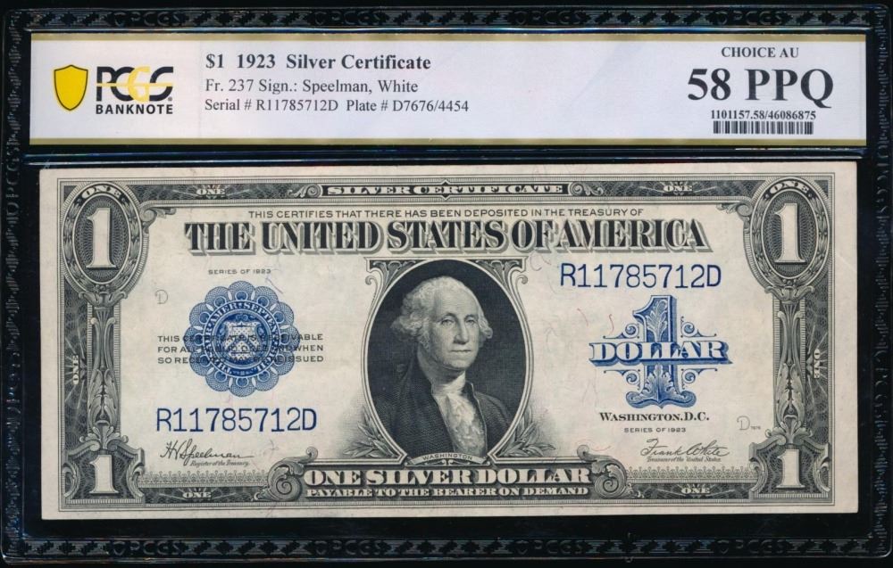 One 1923 $1 Silver Certificate PCGS 58PPQ.