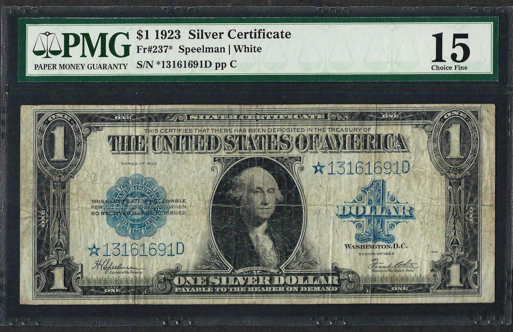 One 1923 $1 Silver Certificate STAR Note Fr.237* PMG Choice Fine 15. PMG Certified.