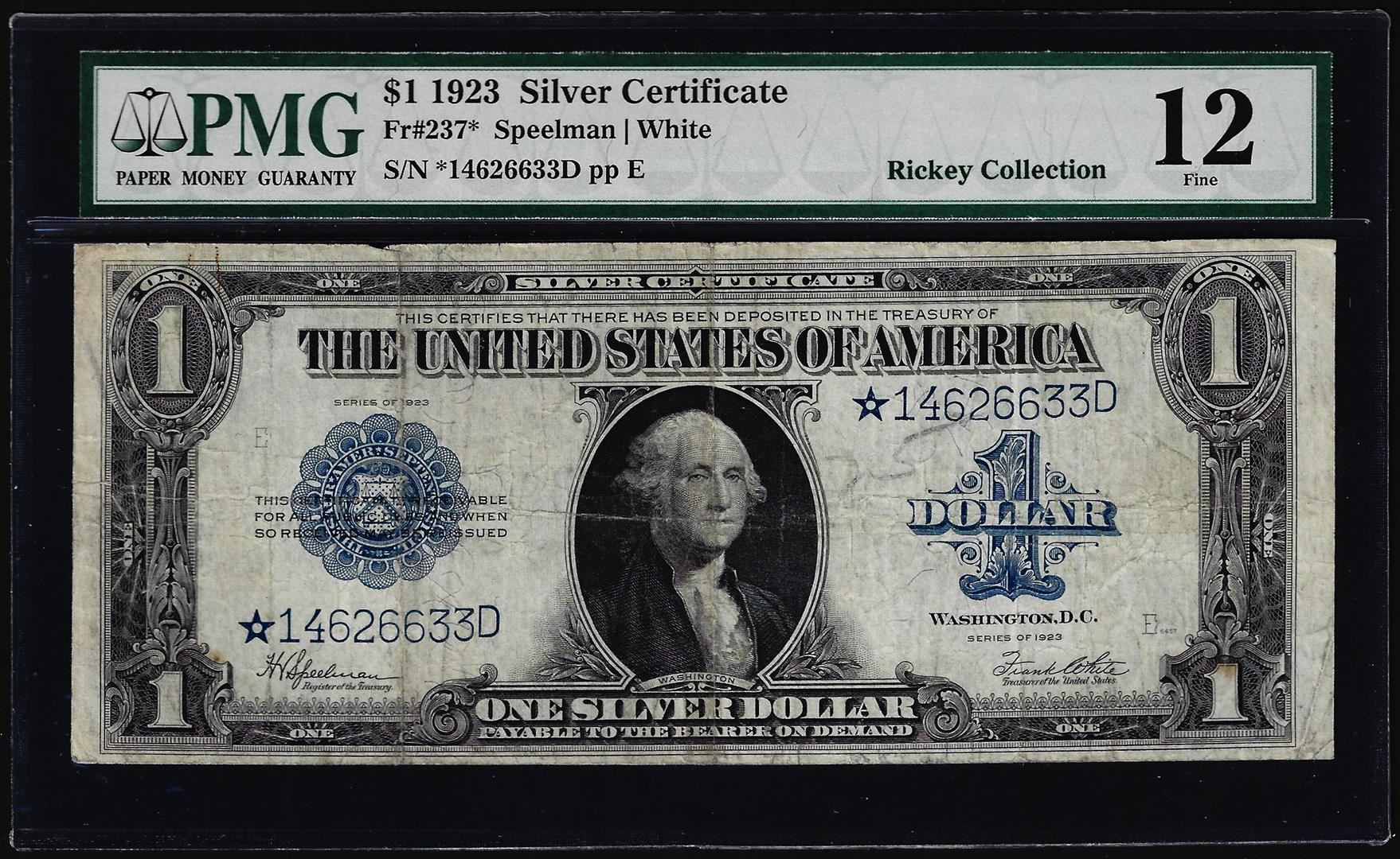 One 1923 $1 Silver Certificate Star Note Fr.237* PMG Fine 12. PMG Certified.