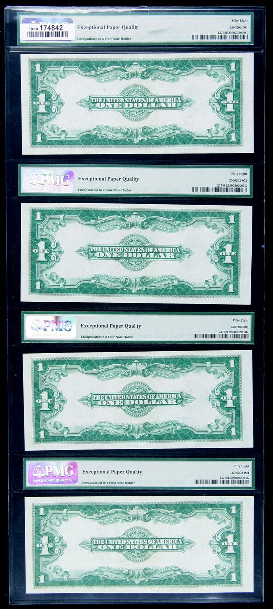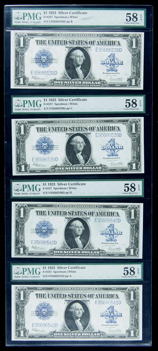 1923, $1 Silver Certificates. Four Consecutive. PMG Choice About Unc 58EPQ. . Fr-237. A lovely run of four consecutive notes, each with a soft fold. In a case of obvious redundancy, PMG has identified these notes as "Encapsulated in a Four Note Holder."