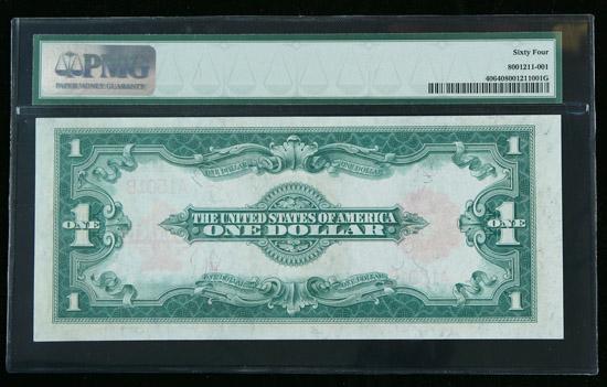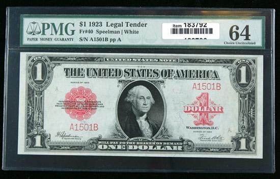 1923, $1 United States Note. PMG Choice Uncirculated 64. . Fr-40. This red seal Ace has good centering and possesses the low serial number A1501B, which certainly adds to its desirability.