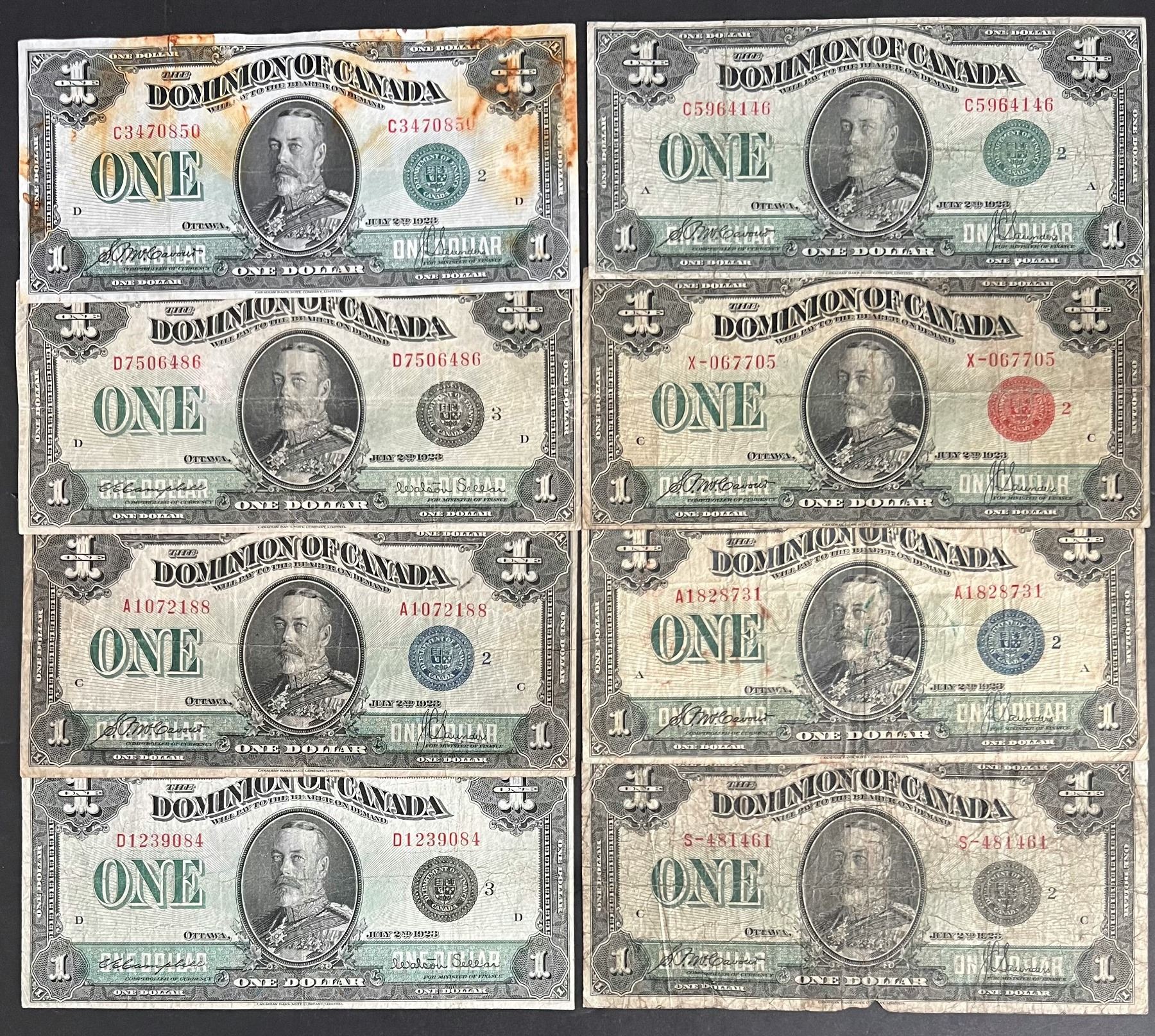 1923 $1's , group of 8 notes with various seals and check letters. VG to VF, one note with stains.