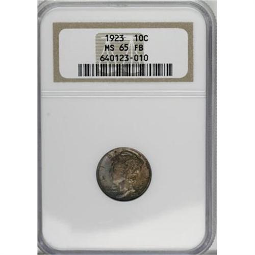 <B>1923 10C MS65 Full Bands NGC.</B></I> NGC Census: (175/118). PCGS Population (272/204). Mintage: 50,130,000. Numismedia Wsl. Price for NGC/PCGS coin in MS65: $240. (#4939)<BR><BR><B>Coin Engraver:</B> Adolph A. Weinman<BR><BR><b>Shipping:</b> Coins & Currency (<a target="_blank" href="http://www.heritageauctions.com/common/shipping.php">view shipping information</a>)