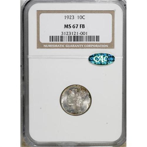 <B>1923 10C MS67 Full Bands NGC. CAC.</B></I> A satiny and elegant Superb Gem, sharply struck with silver-blue centers and emerald toning at the margins. NGC has graded only one finer Full Bands example (3/08).<BR><BR><B>Coin Engraver:</B> Adolph A. Weinman<BR><BR><b>Shipping:</b> Coins & Currency (<a target="_blank" href="http://www.heritageauctions.com/common/shipping.php">view shipping information</a>)