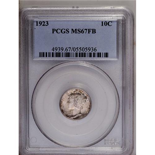 <B>1923<10C> MS67 Full Bands PCGS.</B></I> A lightly toned Superb Gem, nearly the finest quality available. Both sides are fully detailed and free of blemishes. The surfaces have pale rose and gold toning with deeper peripheral iridescence. Population: 55 in 67, 1 finer (5/06).