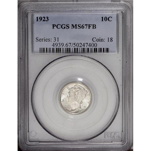 <B>1923<10C> MS67 Full Bands PCGS.</B></I> Well struck except for a hint of weakness on the 3 in the date. Lustrous and virtually pristine with a lightly toned appearance overall. Noticeable die clashing is seen, particularly on the obverse. Population: 49 in 67, 1 finer (1/06).