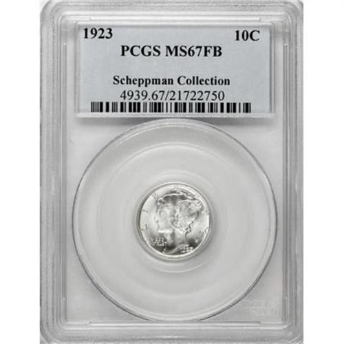 <B>1923 10C MS67 Full Bands PCGS.</B></I> This gorgeous and essentially untoned Superb Gem offers bold definition and remarkable luster. Carefully preserved and delightful. PCGS has graded only two finer Full Bands pieces (12/07).<BR><I>From The Scheppman Collection, #4 PCGS Registry of Full Band Mercury Dimes.</B></I><BR><BR><B>Coin Engraver:</B> Adolph A. Weinman<BR><BR><b>Shipping:</b> Coins & Currency (<a target="_blank" href="http://www.heritageauctions.com/common/shipping.php">view shipping information</a>)