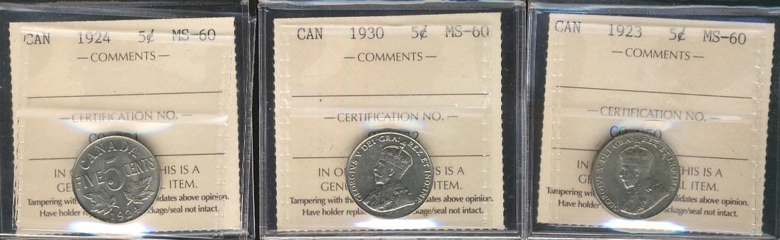 1923, 1924 & 1930 5¢ ICCS MS60. Lot of 3 coins. ICCS tag for the 1924 is damaged.