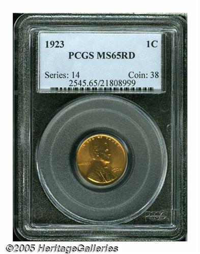 <B>1923<1C> MS65 Red PCGS.</B></I> Bright golden-orange patina is imbued with subtle light green accents. The surfaces display vibrant luster and sharply struck design features. A few miniscule marks in the obverse fields are not bothersome. As of March 2005, PCGS has seen just 72 specimens grading higher in this color designation.