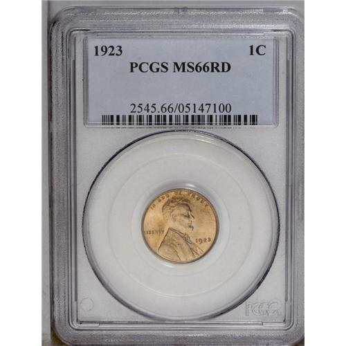 <B>1923<1C> MS66 Red PCGS.</B></I> Fiery orange-red surfaces display radiant luster and no obvious signs of carbon. Population: 73 in 66, 13 finer (3/06). <BR><BR><B>Important notice:</B> Heritage usually auctions material at the rate of 200-250 lots per hour. On some occasions eBay Live bid software or the Internet may not be able to keep up with the pace of the auction. We recommend placing a realistic absentee bid now as insurance to avoid disappointment. Occasionally the auctioneer may eliminate or reject an eBay Live bid, and the auctioneer may also reopen a lot after the close of the eBay live bidding (usually because we missed an audience bid), and may reject your bid even if it shows you as the winning bidder. By bidding via eBay Live, you agree that Heritage may award the lot to another bidder at its sole discretion under the circumstances described above or any other reasonable circumstances. Since eBay bids are not shown to us until we open the lot on the floor, we treat those bids just like floor bids. In most cases the floor responds before the eBay bid is presented to us, due to Internet lag time, so for consistency we have made it a policy that floor bids are always considered first over tie eBay live bids. Also please note that all Heritage lots purchased through eBay Live carry a 20% Buyer's Premium. Please make sure you read the Terms and Conditions before you bid. This lot is being auctioned in conjunction with a live floor auction by Heritage Galleries & Auctioneers. All final auction and invoice information will be supplied by Heritage Galleries & Auctioneers, and all other information should be considered preliminary. Lot:641 <BR><BR><B>Winning Notification and Billing:</B> After the FINAL session in this auction is complete, Heritage will send e-mail and snail mail invoices. This process normally takes several days. All final auction and invoice information will be supplied by Heritage Galleries & Auctioneers, and all other information should be considered preliminary. <BR><BR>This auction will be conducted on a live auction floor and over the Internet through eBay Live. If you choose to place an absentee bid, please take a moment to <font color='#0000ff'><u><a href='http://pages.ebay.com/liveauctions/help/before/laabsentee.html'>learn how eBay Live absentee bidding works</a></u></font><font color='#000000'>
