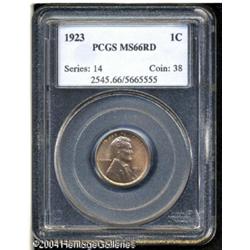 1923 1C MS66 Red PCGS. Well struck with beautiful <B>1923 1C MS66 Red PCGS.</B></I> Well struck with beautiful light color, pleasing full luster, a few flyspecks in the upper left obverse field, and a small contact mark on Lincoln's beard. A really pretty premium Gem. Population: 58 in 66, 10 finer (10/04). <BR><BR><B>Important notice:</B> Heritage usually auctions material at the rate of 200-250 lots per hour. On some occasions eBay Live bid software or the Internet may not be able to keep up with the pace of the auction. We recommend placing a realistic absentee bid now as insurance to avoid disappointment. Occasionally the auctioneer may eliminate or reject an eBay Live bid, and the auctioneer may also reopen a lot after the close of the eBay live bidding (usually because we missed an audience bid), and may reject your bid even if it shows you as the winning bidder. By bidding via eBay Live, you agree that Heritage may award the lot to another bidder at its sole discretion under the circumstances described above or any other reasonable circumstances. Since eBay bids are not shown to us until we open the lot on the floor, we treat those bids just like floor bids. In most cases the floor responds before the eBay bid is presented to us, due to Internet lag time, so for consistency we have made it a policy that floor bids are always considered first over tie eBay live bids. Also please note that all Heritage lots purchased through eBay Live carry a 20% Buyer's Premium. Please make sure you read the Terms and Conditions before you bid. This lot is being auctioned in conjunction with a live floor auction by Heritage Galleries & Auctioneers. All final auction and invoice information will be supplied by Heritage Galleries & Auctioneers, and all other information should be considered preliminary. Lot:5291