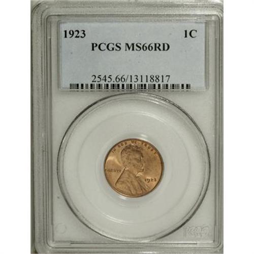 <B>1923 1C MS66 Red PCGS.</B></I> A magnificent razor-sharp Premium Gem with dazzling luster and exceptional eye appeal. Devoid of marks, and carbon is minimal. Population: 77 in 66 Red, 13 finer (5/07).<BR><BR><b>Shipping:</b> Coins & Currency (<a target="_blank" href="http://www.heritageauctions.com/common/shipping.php">view shipping information</a>)