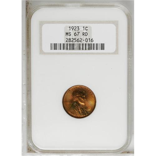 <B>1923<1C> MS67 Red NGC.</B></I> Bands of gold, red, crimson, and olive toning wash the smooth surfaces of this Superb Gem. Blessed with a sharp strike and a minimum of distractions. Only one coin has been given a higher grade by NGC and PCGS combined. Census: 15 in 67, 0 finer (7/06).