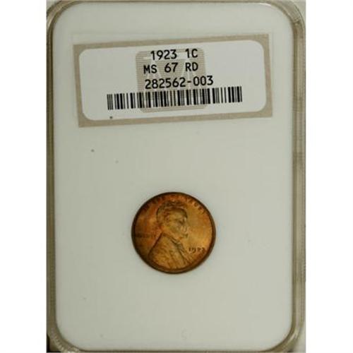 <B>1923 1C MS67 Red NGC.</B></I> Orange-red and lemon-gold endow this lustrous and exactingly struck Superb Gem. The fields are remarkably free from flecks or marks. In a former generation holder. Census: 15 in 67 Red, 0 finer (1/08).<BR><BR><B>Coin Engraver:</B> Victor D. Brenner<BR><BR><b>Shipping:</b> Coins & Currency (<a target="_blank" href="http://www.heritageauctions.com/common/shipping.php">view shipping information</a>)