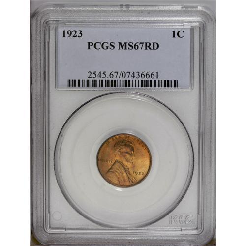 <B>1923<1C> MS67 Red PCGS.</B></I> The 1923-P is a common issue in all grades, and is a coin that is often used for type purposes. However, it is not quite as available as one might think, considering that almost 75 million pieces were produced. The certified population with a Red designation begins to decline at the MS65 and higher grade levels. In MS67, the grade of the specimen offered here, only 27 pieces have been certified by both of the major services, with one finer. Razor-sharp features are apparent over each side which is covered with shimmering mint luster. This luster still retains the bright, original orange-red color in some places, but much of each side is also framed in a deep cherry-red patina, which gives the coin a dazzling tone-on-tone effect. PCGS Population: 12 in 67, 1 finer (3/06). <BR><BR><B>Important notice:</B> Heritage usually auctions material at the rate of 200-250 lots per hour. On some occasions eBay Live bid software or the Internet may not be able to keep up with the pace of the auction. We recommend placing a realistic absentee bid now as insurance to avoid disappointment. Occasionally the auctioneer may eliminate or reject an eBay Live bid, and the auctioneer may also reopen a lot after the close of the eBay live bidding (usually because we missed an audience bid), and may reject your bid even if it shows you as the winning bidder. By bidding via eBay Live, you agree that Heritage may award the lot to another bidder at its sole discretion under the circumstances described above or any other reasonable circumstances. Since eBay bids are not shown to us until we open the lot on the floor, we treat those bids just like floor bids. In most cases the floor responds before the eBay bid is presented to us, due to Internet lag time, so for consistency we have made it a policy that floor bids are always considered first over tie eBay live bids. Also please note that all Heritage lots purchased through eBay Live carry a 20% Buyer's Premium. Please make sure you read the Terms and Conditions before you bid. This lot is being auctioned in conjunction with a live floor auction by Heritage Galleries & Auctioneers. All final auction and invoice information will be supplied by Heritage Galleries & Auctioneers, and all other information should be considered preliminary. Lot:642 <BR><BR><B>Winning Notification and Billing:</B> After the FINAL session in this auction is complete, Heritage will send e-mail and snail mail invoices. This process normally takes several days. All final auction and invoice information will be supplied by Heritage Galleries & Auctioneers, and all other information should be considered preliminary. <BR><BR>This auction will be conducted on a live auction floor and over the Internet through eBay Live. If you choose to place an absentee bid, please take a moment to <font color='#0000ff'><u><a href='http://pages.ebay.com/liveauctions/help/before/laabsentee.html'>learn how eBay Live absentee bidding works</a></u></font><font color='#000000'>