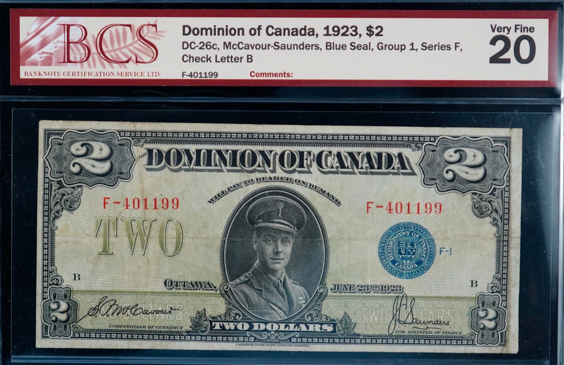The cataloguer has taken every reasonable measure to ensure that all of the lots in this sale are as described and genuine. All raw coins and banknotes have been graded by the cataloger or the auction house which represent our best professional opinion. To grade coins and banknotes, we use Canadian grading standards, 42 years of experience and good conscience. However, grading is a subjective description in the opinion of the cataloger or the auction house. Among experts there are often differences of opinion on the grading and the eye appeal of a coin. The strike and the state of preservation are often debated. The Canadian Numismatic Company acts as an agent between consignors and buyers. The Canadian Numismatic Company does not guarantee that any coin or banknote cataloged will meet the standards, or the grade, of any third party grading companies. No warranty, whether impressed or implied. Items are as is, no warranty given. We cannot accept responsibility and waive all liability resulting in financial losses, and or incidentals accruing from the sale of any items, nor can we guarantee that items graded by third party services will grade the same if submitted to a different grading service or re-submitted to the same company. Statements by The Canadian Numismatic Company regarding the condition, the eye appeal, the strike and the population of items are for guidance only. All lots offered are sold "AS IS". Title to all lots remains with the auction house until paid for in full by the purchaser. But they are held at the risk of the purchaser once the time of the sale.