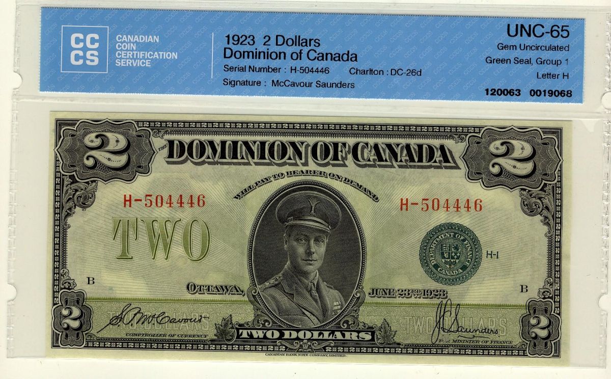 1923 $2 DC-26d /H-504446 CCCS UNC65. Very scarce this nice. Flashy.