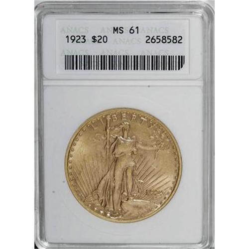 <B>1923 $20 MS61 ANACS.</B></I> NGC Census: (1768/18291). PCGS Population (1337/13773). Mintage: 566,000. Numismedia Wsl. Price for NGC/PCGS coin in MS61: $720. (#9175)<BR><BR><B>Coin Engraver:</B> Augustus Saint-Gaudens<BR><BR><b>Shipping:</b> Coins & Currency (<a target="_blank" href="http://www.heritageauctions.com/common/shipping.php">view shipping information</a>\)