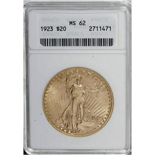 <B>1923 $20 MS62 ANACS.</B></I> NGC Census: (8252/10039). PCGS Population (5319/8454). Mintage: 566,000. Numismedia Wsl. Price for NGC/PCGS coin in MS62: $735. (#9175)<BR><BR><B>Coin Engraver:</B> Augustus Saint-Gaudens<BR><BR><b>Shipping:</b> Coins & Currency (<a target="_blank" href="http://www.heritageauctions.com/common/shipping.php">view shipping information</a>\)