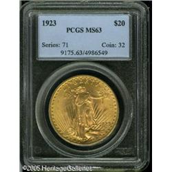 <B>1923 $20 MS63 PCGS.</B></I> A sharply struck and attractively preserved available date Twenty that has vigorous luster and good eye appeal. Lot:9624