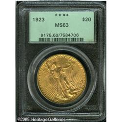 <B>1923 $20 MS63 PCGS.</B></I> This well struck double eagle reveals some light to moderate grade-defining marks on the straw-gold surfaces. Lot:9625