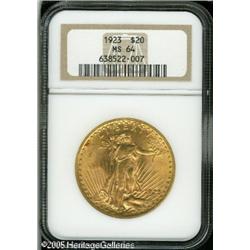 <B>1923 $20 MS64 NGC.</B></I> A pleasing, lustrous coin that is overlaid with even reddish color. An alloy spot on the upper left obverse rim, near ten o'clock, is only mildly distracting. Lot:9628