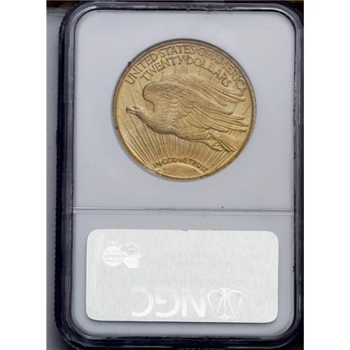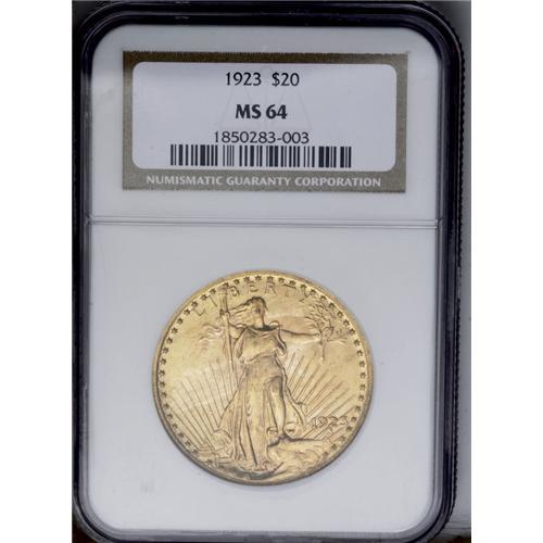 <B>1923<$20> MS64 NGC.</B></I> Variegated orange-rose and mint-green toning is illuminated by satiny luster on each side of this well struck near-Gem. A modest number of obverse abrasions define the grade.
