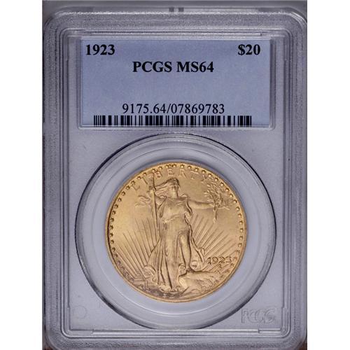 <B>1923<$20> MS64 PCGS.</B></I> A shimmering and unblemished near-Gem. The strike is full on the Capitol building, and only the sun shows moderate softness. Although the 1923 is regarded as a common date, it is perhaps 200 times scarcer than the 1924 in MS64 and higher grades.