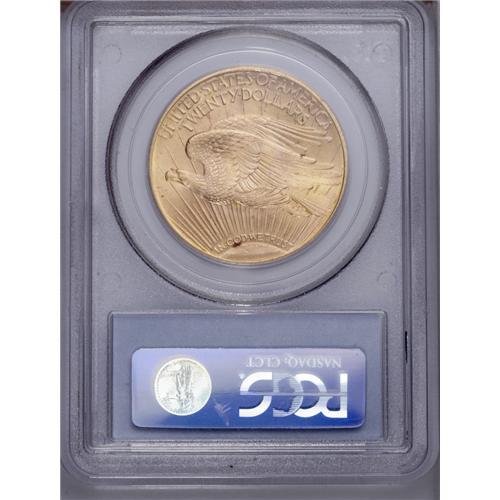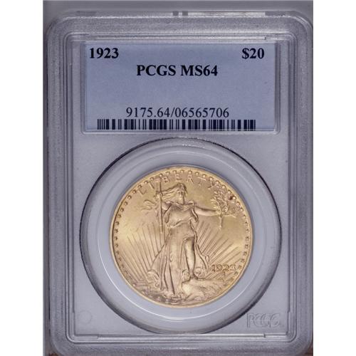 <B>1923 $20 MS64 PCGS.</B></I> Clean surfaces and flashy with a sharp strike and a few scattered marks. Two or three small red-orange alloy spots are evident on each side of the coin. A bright and highly attractive near-Gem.