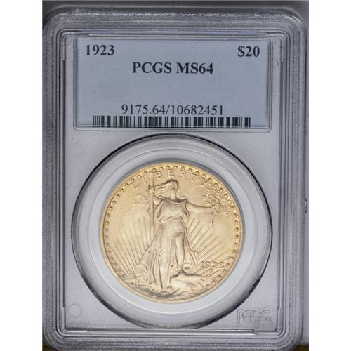 <B>1923<$20> MS64 PCGS.</B></I> Glowing luster emanates from apricot-gold surfaces that reveal a few minor grade-defining marks, especially on the lower reverse. The design elements are generally well struck, save for weakness on the Capitol dome.